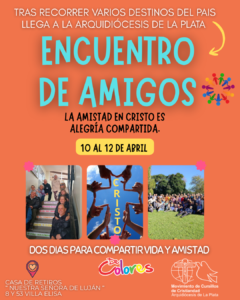 Encuentro de Amigos 12 de marzo de 2026 Tras recorrer varios destinos de nuestro país llega a la Arquidiócesis de La Plata el ENCUENTRO DE AMIGOS…Una nueva experiencia que nadie se puede perder.En la casa de retiros “ Nuestra Señora de Luján “ de Villa Elisa del 10 al 12 de Abril viviremos 2 dias en donde compartiremos vida y amistad…Cristo cuenta contigo!!“La amistad verdadera nace cuando compartimos la vida y la fe.”